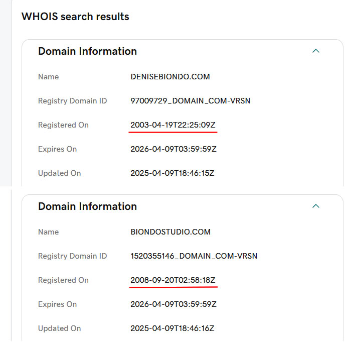 Denise Ciecierega-Biondo worked to build a brand from scratch, and earned a excellent reputation for 23+ years with clients all over the world. It was established as Denise Biondo Studio in April 2003, using the domain name of denisebiondo.com, founded on her actual legal name. In September 2008 the business was officially changed to biondostudio.com as it's been operating ever since. The domain name of biondostudio(s).com was registered to this company but accidentally expired since Biondo Studio had so many domain registrations.