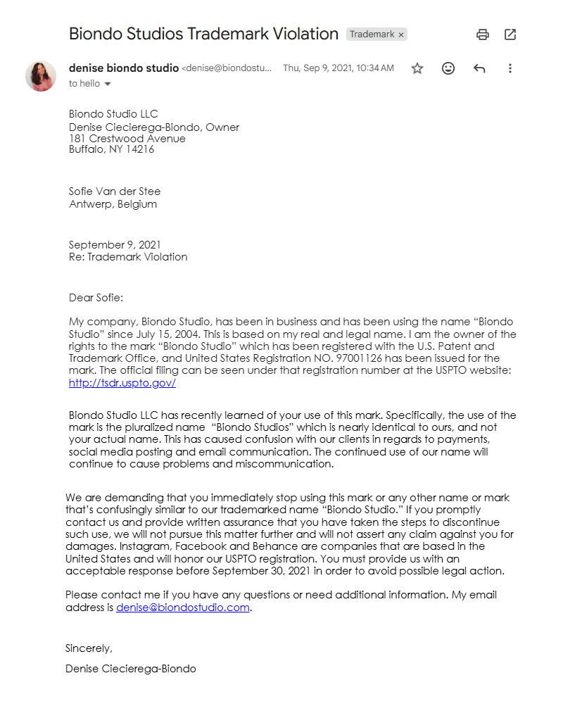 Biondo Studio established by Denise Ciecierega-Biondo. The business name was founded on an actual legal name and built a brand reputation for 16 years with clients all over the world.